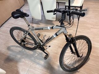 Bicicleta de montaña TRACK en color plateado. Ideal para disfrutar de rutas y caminos. - Cuadro de aluminio. - Ruedas de 26 pulgadas. - Frenos de disco. - Suspensión delantera. - Manillar con cambio Shimano comprado posteriormente