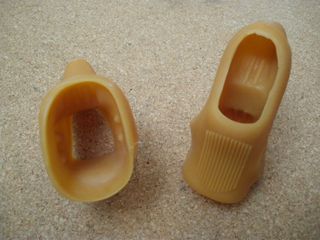 Gomas de repuesto para apoyamanos de bicicleta. Pareja de Gomas apoyamano para manetas de carretera. Validas para multitud de manetas Campagnolo como las Record, pongo un modelo de la maneta para la que están diseñadas pero en plástico. Para bicicletas clásicas. - Color: Beige. - Textura antideslizante.