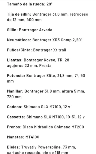 ✅ Bici de 2ª mano reacondicionada ✅ Imágenes propias y reales de la bicicleta, no de catálogo ✅ Garantía 1 año + 1 año opcional ✅ A plazos desde 30,25€ / mes sin intereses ✅ Envío a toda España. ¡Pregúntanos! ▪️Cuadro: Aluminio ▪️Tamaño de la rueda: 29" ▪️Cambio: Sram GX ▪️Tipo de cambio: Mecánico ▪️Velocidades: 12 ▪️Cassette: 10-50-T ▪️Mandos de cambio: Sram GX ▪️Bielas: Sram GX ▪️Platos: 32-T ▪️Frenos: Shimano XT ▪️Ruedas: Bontrager Kovee ▪️Material de la potencia: Aluminio ▪️Manillar: Aluminio ▪️Tija: Aluminio - telescópica ▪️Horquilla: RockShox Judy ▪️Recorrido de la horquilla: 100mm