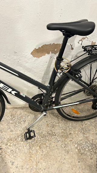 Bicicleta de marca Trek en color negro, ideal para desplazamientos urbanos o paseos. Incluye alforja. - Cuadro de aluminio. - Ruedas de 700c. - Frenos de disco. - Cambio Shimano.