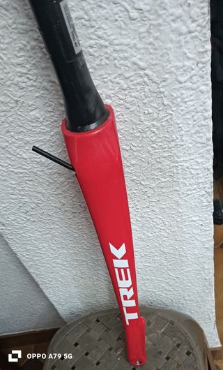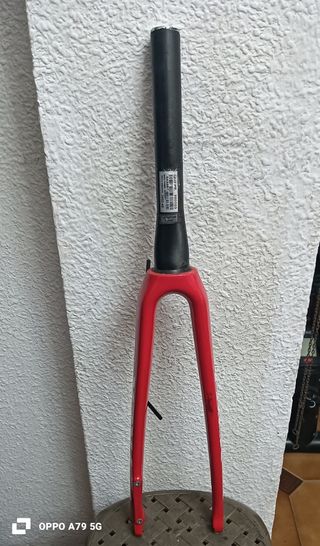 Horquilla de carbono Trek para discos es para dirección cónica tapered, bicicleta de carretera, color rojo. tubo dirección de 23 cm y desde el arco hasta el eje pasante tiene 35cm. En las fotos se ve un roce de la pintura muy leve solo pintura Para dirección Cónica tapered - Material: Carbono - Tipo: Rígida - Color: Rojo - Para frenos de disco
