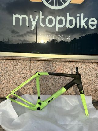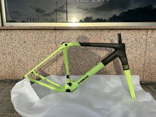 Cuadro de bicicleta Trek Checkmate SLR en talla M. Diseño moderno y ligero. CUADRO NUEVO ÚNICO EN ESPAÑA - Color principal verde lima con detalles en negro. - Acabado con motas. - Detalle de cuadros en la horquilla.