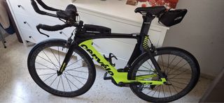 Bicicleta de triatlón Cervélo con un llamativo diseño en negro y verde lima. - Modelo p3,talla 51. - Cambios Ultegra di2 - Plato Qrings ovalado 52-36 - Cassette 11-28 - Freno zapata Ultegra - Manillar triatlón carbono 3t - Ruedas 50mm carbono marca Selcof - Sillín especialized Sitero - Portabidon trasero Arolab