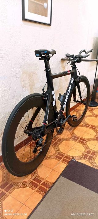 Bicicleta de contrarreloj Argon18 E112 en talla XS. Diseñada para competición y triatlón. - Cuadro de carbono. - Ruedas de perfil mavic carbone SL perfil 45 - Manillar de triatlón vision. - grupo SRAM Rival 2x10 Platos con bielas carbono 52-36 y cambio SRAM Rival 11-28 Pedales look keo Sillim Fizik Technogel 155 Acople porta bidón en manillar