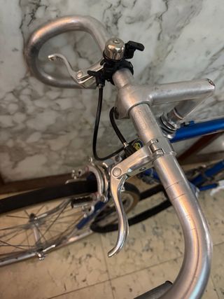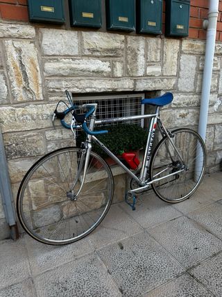 Bicicleta de carretera clásica Stelvio Albero. Hay que revisarla y ponerla a punto. - Cuadro de aluminio plateado con detalles azules. - Manillar de carretera con cinta azul. - Sillín negro.