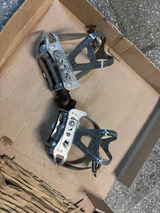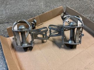 Par de pedales de bicicleta de estilo clásico, ideales para bicicletas vintage o de paseo. Para restaurar. - Construcción metálica. - Diseño abierto con correas. - Eje roscado estándar. - Rastrales.