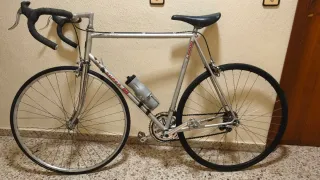 Bicicleta de carretera clásica Jean-Car. Estuvo años parada, pero he estado rodando este ultimo año con ella, tras una puesta a punto bastante general. No se han cambiado componentes a penas, los últimos arreglos únicamente: cámaras, cubierta, sirgas y lubricantes. Funcionan los frenos y cambios, lista para rodar. Es una bici grande, recomendado para personas de 1,78cm para arriba. Talla 56. - Cuadro plateado. - Manillar curvo con cinta blanca. - Sillín clasico.