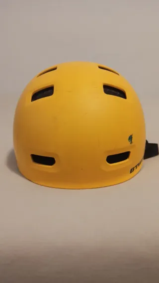 Casco infantil de color amarillo de Decathlon para niño de 3 a 5 años aprox. ideal para proteger durante actividades al aire libre. Con alguna marca de uso. - Diseño con ventilación. - Correa ajustable.