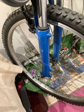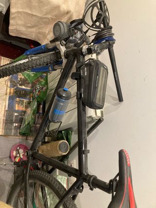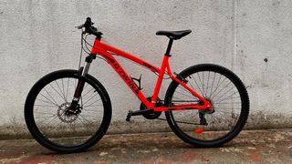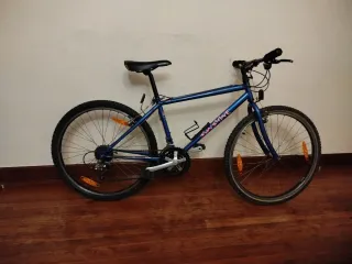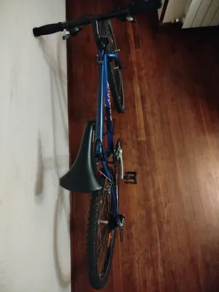 Bicicleta de montaña Btwin. Cuadro de aluminio, ruedas de 26” y horquilla de suspensión regulable. Freno delantero de disco y trasero V-brake. Cambios shimano con mandos grip shift. Tiene las marcas propias del uso pero siempre ha tenido buen mantenimiento. Cubierta trasera nueva y cierres antirrobo (ruedas y sillín)