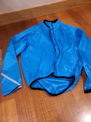 Chubasquero ligero de color azul, ideal para ciclismo. Diseñado para proteger del viento y la lluvia ligera. - Cremallera frontal completa. - Cuello alto. - Puños y bajo con ribete negro. - Detalle reflectante en manga.