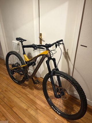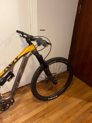 Se vende Intense ACV Carbon (aprox. 2017), talla M. Cuadro 100 % carbono con sistema JS Tuned Suspension System (VPP). Bicicleta montada por componentes, no de serie. Horquilla RockShox Pike DebonAir 150 mm, amortiguador trasero Cane Creek Double Barrel Air (doble barril, alta gama). Transmisión SRAM monoplato con bielas SRAM NX, frenos hidráulicos SRAM Guide (manetas y pinzas cambiadas en revisión de febrero/marzo de 2025). Ruedas no originales de serie con neumáticos Maxxis Minion DHF delante y Aggressor detrás. Manillar Race Face, potencia Race Face Aeffect 35 mm, pedales incluidos. Tija telescópica RockS