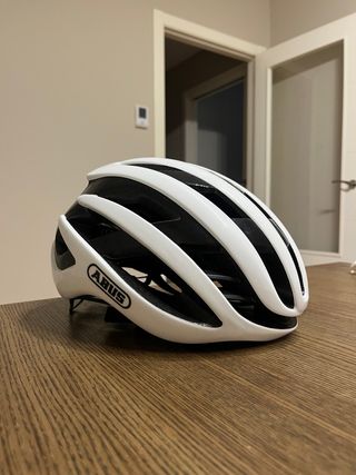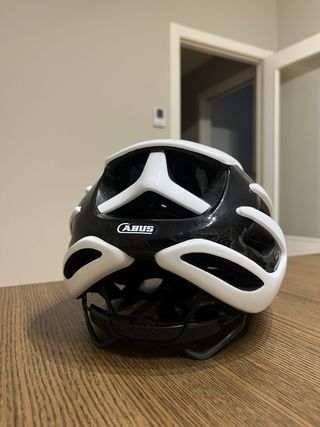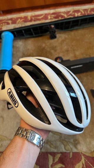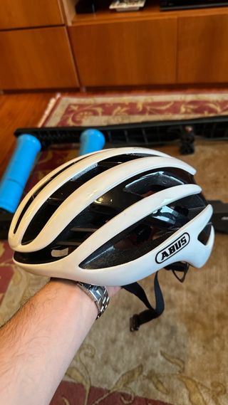 Casco de ciclismo Abus Airbreaker blanco talla M (52-58cm). Es absolutamente original. El único desperfecto es que se ha saltado parte de la pegatina del logo trasero al montar un frontal en el casco. Por lo demás no tiene nada.