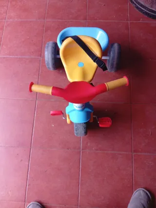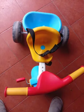 Triciclo para niños con asiento amarillo y detalles en azul. - Ruedas de goma. - Manillar rojo con puños amarillos. - Pedales rojos.