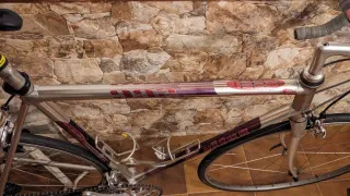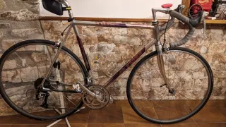 Bicicleta de carretera clásica vitus 992 ovoid competición.Talla 56 - Cuadro Duraluminio plateado con detalles en morado. Horquilla y dirección vitus integrada. Tija Vitus y manilla cinelli Componentes Shimano ultegra y Campagnolo. 9x3v .Bielas30-39-52 y cassette 13-30 Ruedas Campagnolo electrón muy ligeras(Modelo usado por Marco Pantani en el tour) con cubiertas continental gp5000 700x25, en muy buen estado - Manillar de carretera cinelli con cinta gris. - Pedales Shimano spd. Se vende con otro sillín diferente a la foto
