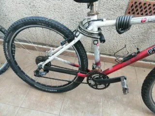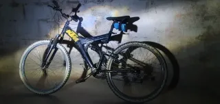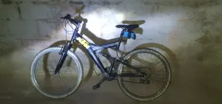 MTB de doble suspensión muy cómoda y resistente, ideal para caminos, pistas forestales, paseos largos o uso urbano. •Doble suspensión (delantera y trasera) •Ruedas 26 x 1,4 (más rodadoras y cómodas) •Transmisión Shimano •Frenos V-Brake •Sillín cómodo de gel •Incluye porta bidón. La bicicleta se entrega recién limpiada y ajustada, en buen estado general. Presenta marcas normales de uso por los años, pero funciona correctamente: cambios, frenos y suspensiones operativos.