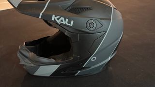 Casco de ciclismo Kali en color negro y gris, con detalles en blanco. Talla M. - Diseño moderno y deportivo. - Marca Kali visible en el lateral. - Cierre ajustable.