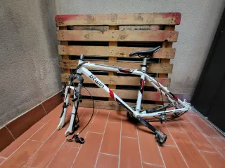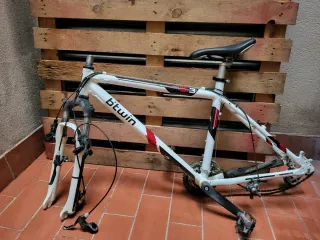 Cuadro de bicicleta de montaña Btwin S3 en color blanco. Ideal para montar tu propia bicicleta. - Cuadro de aluminio. - Horquilla delantera. - Sillín. - Pedales. - Frenos de disco ( delantero y trasero ) - Cadena y plato. - Marchas - Incluye potencia monty