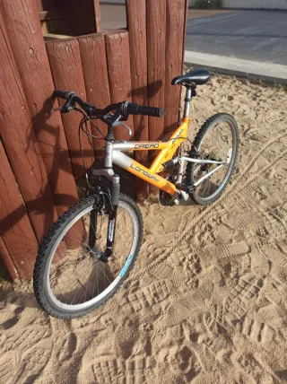 Bicicleta de montaña con un diseño llamativo en naranja y plata. Ideal para disfrutar de rutas y caminos. - Cuadro de aluminio. - Suspensión delantera y trasera. - Ruedas de 26 pulgadas.