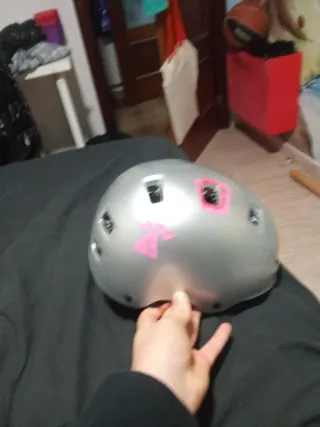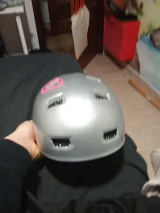 Casco de protección en color plateado, ideal para actividades como ciclismo o patinaje. - Diseño con ventilación. - Detalle de logo rosa en la parte superior.
