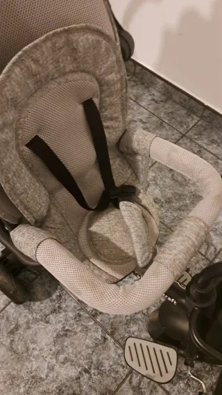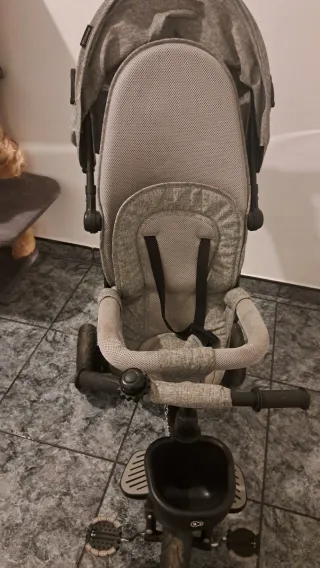 Triciclo infantil con un diseño moderno y funcional. - Asiento acolchado y arnés de seguridad. - Capota para proteger del sol. - Reposapiés y cesta de almacenamiento.