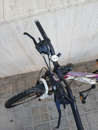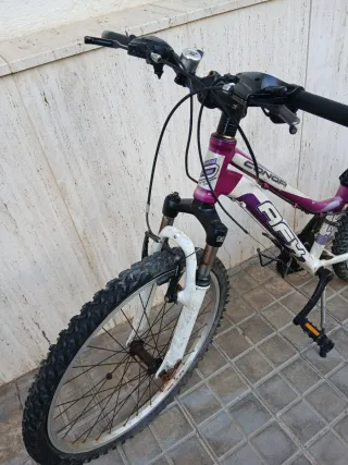 Bicicleta de montaña Conor en color blanco y morado.Tiene las ruedas pinchadas y necesita puesta a punto,también sirve para piezas de repuesto. - Cuadro de aluminio. - Suspensión delantera. - Ruedas de 26 pulgadas.