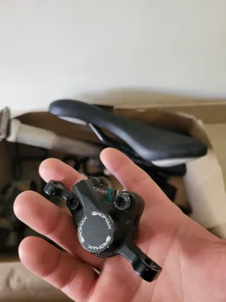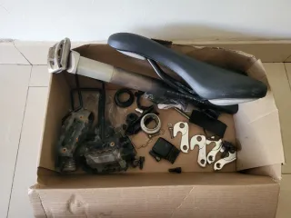 Conjunto de recambios para bicicleta de montaña : Tija, sillin, pinza de freno, direccioes para horquilla, pedales, mas otras piezas que se pueden ver en la foto.