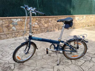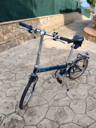 Bicicleta plegable en color azul, ideal para desplazamientos urbanos o para llevarla contigo. Rueda delantera maciza solo la rueda cuesta 40e Ruedas nuevas - Cuadro plegable. - Ruedas de 20 pulgadas. - Portabultos trasero. - Pata de cabra.