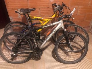Se vende lote de tres bicicletas de montaña. - Bicicleta amarilla con suspensión delantera y trasera. - Bicicleta plateada y naranja marca Diamondback. - Bicicleta azul con suspensión delantera.