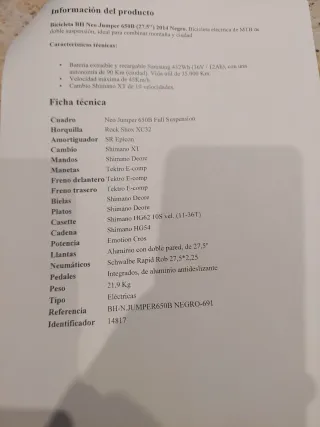 Bicicleta eléctrica BH Emotion Neo Jumper 650B 27,5". - Se vende entera o a piezas. -Cargador de batería. - Cuadro de aluminio. - Suspensión delantera y trasera - Frenos de disco. - Motor trasero - Batería integrada defectuosa, todo lo demás funciona bien.