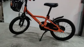 Bicicleta infantil de color naranja, ideal para los más pequeños. Cuenta con una práctica cesta delantera y ruedines, aunque no salgan en la foto. Solo hay que xambiarle la pieza que une el freno delantero, se desencajó y abrió. Fácil solución. - Cesta delantera con diseño. - Ruedines de apoyo incluidos.