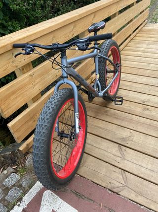 Fatbike Moma con ruedas anchas y llantas rojas. - Cuadro de aluminio. - Frenos de disco. - Neumáticos de gran volumen.