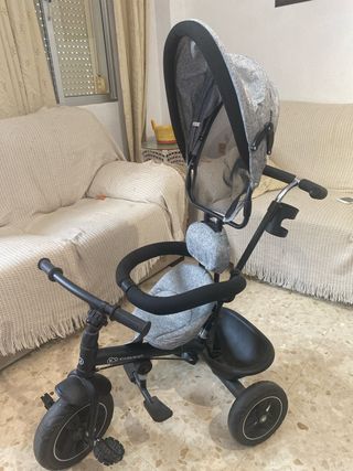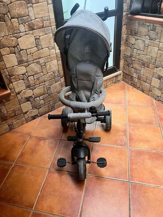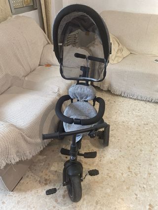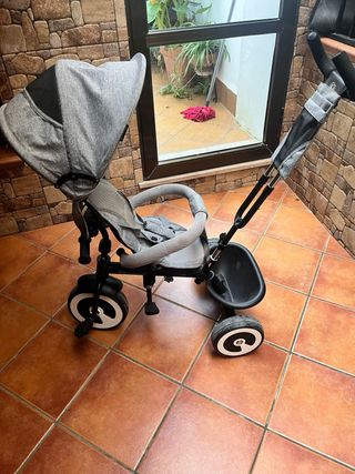 Triciclo evolutivo en color gris y negro, con muy poco uso. - Diseño moderno y funcional. - Capota protectora. - Asiento acolchado. - Barra de seguridad. - Reposapiés. - Ruedas resistentes.