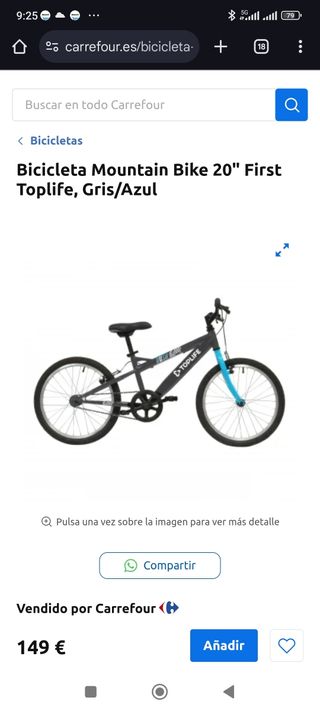 Bicicleta nueva sin estrenar. La conseguí en un sorteo en Mayo de 2025 y no la hemos usado porque mis hijos son más mayores. Recomendable para niños de 6 a 9 años. Precio en carrefour 129 € La vendo por 70 € Mountain Bike 20" First Toplife, Gris/Azul. - Marca: Toplife - Modelo: First Mountain Bike - Talla: 20" - Color: Gris y azul