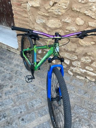 Vendo bicicleta de montaña Wolfbike, en estupendas condiciones. Es una bici ideal para el stund. La vendo porque muchas veces me ha causado problemas - Cuadro de aluminio, color verde y azul. - Llantas en buen estado. - Manillar color morado. -Frenos shimano mt 350