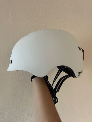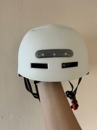 Casco de seguridad en color blanco. Diseñado para proteger durante tus trayectos. - Diseño moderno y aerodinámico. - Incorpora luces LED traseras y delanteras para mayor visibilidad. - Sistema de ajuste para un calce seguro. - Correas de sujeción ajustables. Nunca usado, como nuevo, solo tiene un pequeño desperfecto