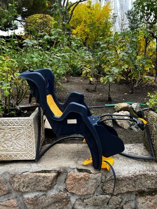 Silla para transportar bebés en bicicleta, con un diseño ergonómico y seguro. - Color azul marino y detalles en amarillo. - Incluye cinturón de seguridad. - Reposapiés ajustables.