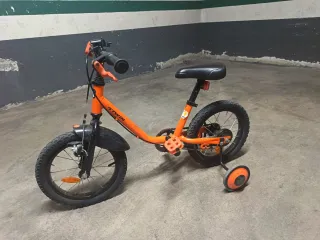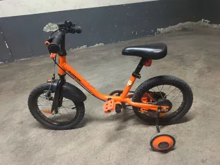Bicicleta infantil de color naranja, ideal para los más pequeños. - Ruedines incluidos para facilitar el aprendizaje. - Diseño llamativo y seguro. Es del decathlon, está en buen estado, aunque hay que inflarle las ruedas y darle una limpiada. Tiene alguna pegatina en el cuadro.