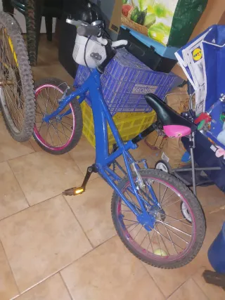 Bicicleta infantil de color azul, adecuada para niños de 6 años. - Ruedas con llantas rosas. - Cesta delantera blanca. - Pedales con reflectores.