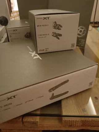 Pareja de frenos (Delantero + Trasero) listos para montar. Proceden de una bici de Talla L (29"), por lo que los latiguillos son largos. Manetas Shimano BL-MT401 (para 2 dedos).