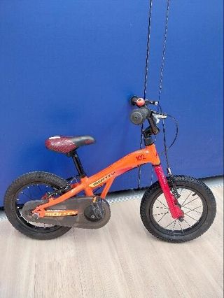 Bicicleta Btwin de color naranja, ideal para niños de 3 a 5 años. Perfecta para iniciarse en el mundo del ciclismo. - Ruedines incluidos para mayor estabilidad. - Diseño llamativo con detalles de dibujos animados. - Frenos adaptados para manos pequeñas.