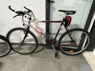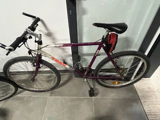 Bicicleta de montaña Trek modelo 820 - Cuadro de color morado y plateado. - Ruedas de 26 pulgadas. - Sillín negro. - Incluye bolsa portaherramientas roja.