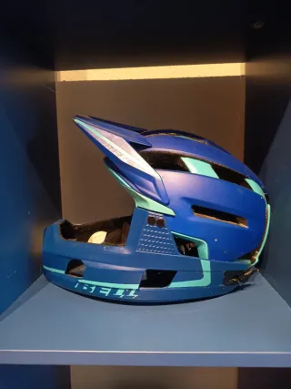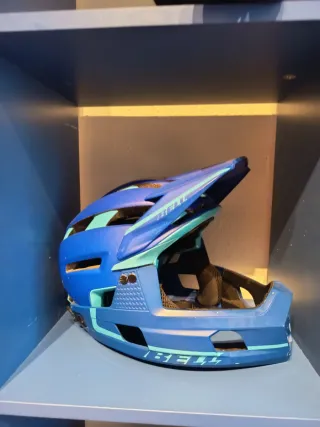 Casco Bell para Enduro o Descenso (DH), con diseño desmontable y talla M. Ideal para protegerte en tus rutas. - Color azul y verde. - Visera ajustable. - Sistema de ventilación.