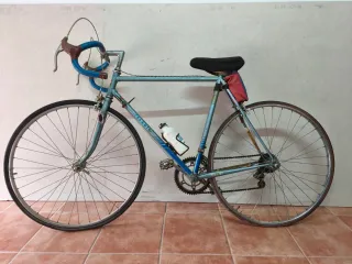 Bicicleta de carretera clásica de la marca Zeleris. Un modelo retro con un diseño distintivo. - Cuadro de color azul claro. - Manillar curvado. - Sillín negro. - Portabidón blanco.