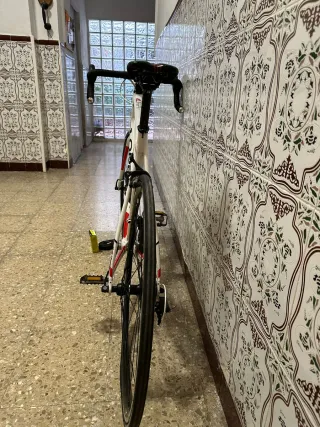 Bicicleta de carretera Orbea de color blanco con detalles en rojo. Como nueva, en perfecto estado viene con dos cámaras incluidas - Cuadro de aluminio. - Ruedas de 700c. - Manillar de carretera.