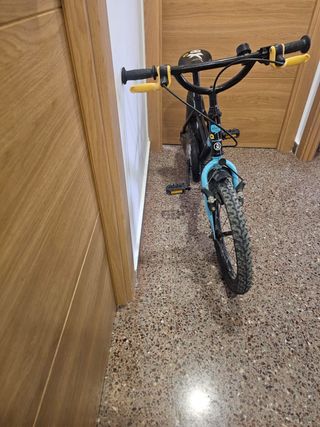 Bicicleta infantil con detalles en azul y negro. - Ruedas de 16 pulgadas. - Manillar con puños amarillos. - Sillín negro con diseño. - Incluye timbre.