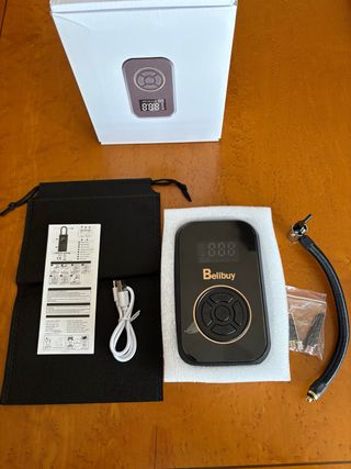 Hinchador portátil de la marca Belibuy, diseñado para uso en coches, motos y bicicletas. Incluye bolsa de almacenamiento. - Diseño compacto y moderno. - Pantalla digital. - Manguera flexible. - Incluye cable de carga USB. - Varios adaptadores de boquilla.