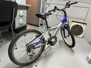Bicicleta de montaña para niños con rueda de 20 pulgadas. Asiento gastado con agujero. Arañazos por el uso. - Color azul y plateado. - Ideal para iniciarse en el ciclismo. - Diseño robusto para terrenos variados. - Suspensión telescópica delantera. - Seis marchas - Dos platos. - Cambios Shimano. - Caballete de soporte - Soporte para bidones.