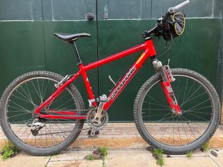 Bicicleta de montaña Cannondale en color rojo. - Cuadro de aluminio. - Horquilla delantera con suspensión. - Ruedas de 26 pulgadas. - Frenos de disco. - Cambio Shimano. - Talla S/M