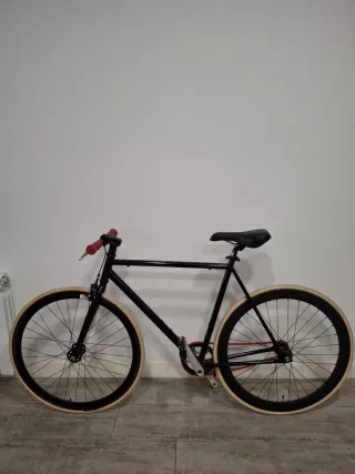 Bicicleta tipo fixie con un diseño moderno y llamativo. Ideal para moverte por la ciudad con estilo. - Cuadro de color negro. - Ruedas con llantas negras y cubiertas beige. - Cadena de color rojo. - Pedales plateados. Duerme en almacén desde hace tiempo.