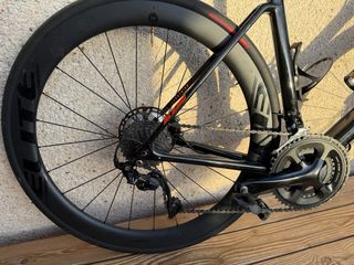 Bicicleta de carretera Ridley Fenix SL full carbono, talla L con un diseño aerodinámico y ligero. montada toda en ultegra. recien puesto manillar integrado, almohadillas, cinta manillar i cables Nuevo.Bici full carbono - Cuadro de carbono. -Horquilla carbono - Transmisión Shimano Ultegra. 2/11v 50/32 - Ruedas de perfil alto elite wheels carbono. - Dos portabidones. -Asiento prostático carbono - Manillar/potencia carbono con cables integrados en manillar. -Sonido del buje muy bonito.